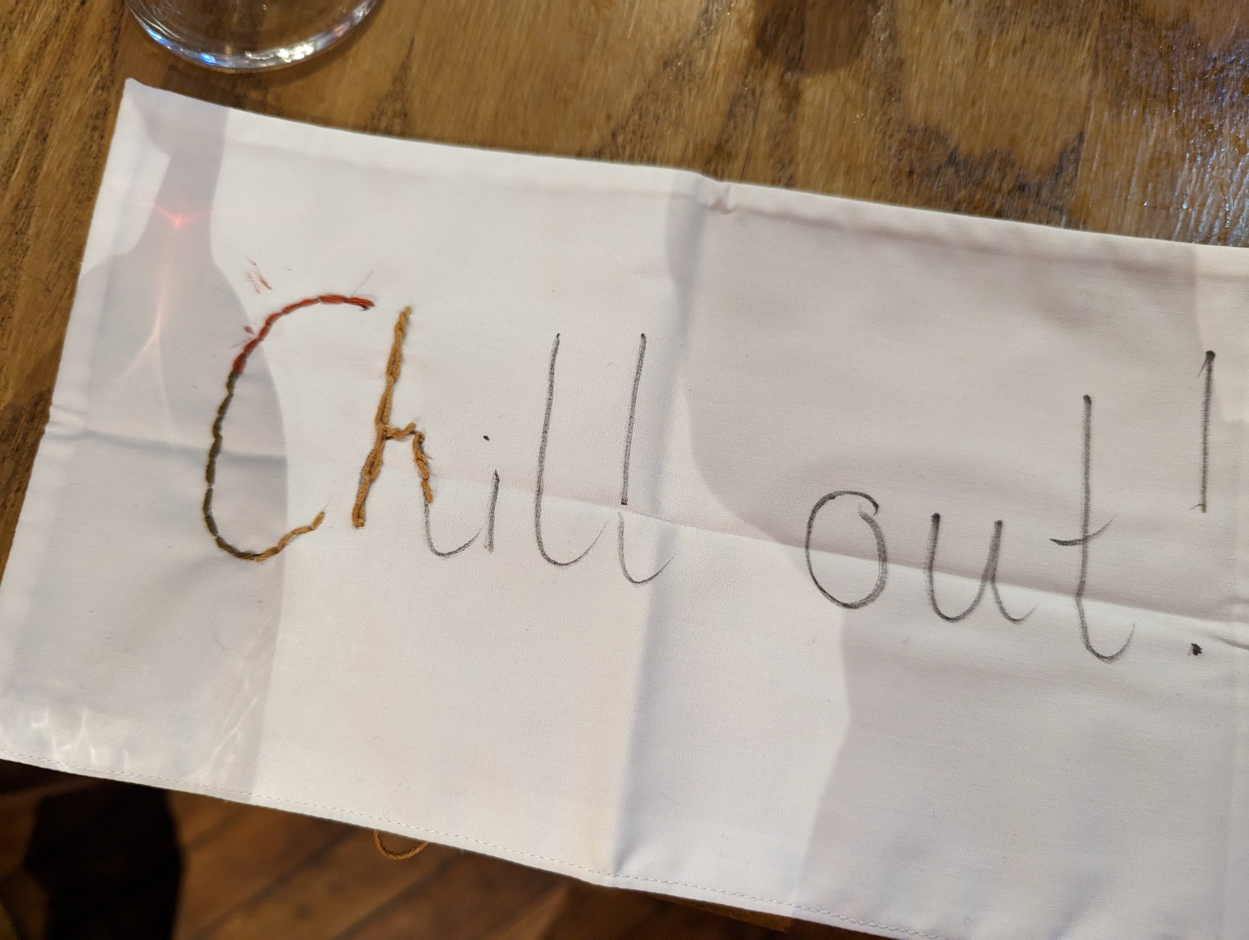 One lovely lady came over to ask about what I was doing – perhaps the table turned into a haberdashery was a clue…luckily she was intrigued enough to join me, and began creating a beautiful message to herself, to simply Chill Out.