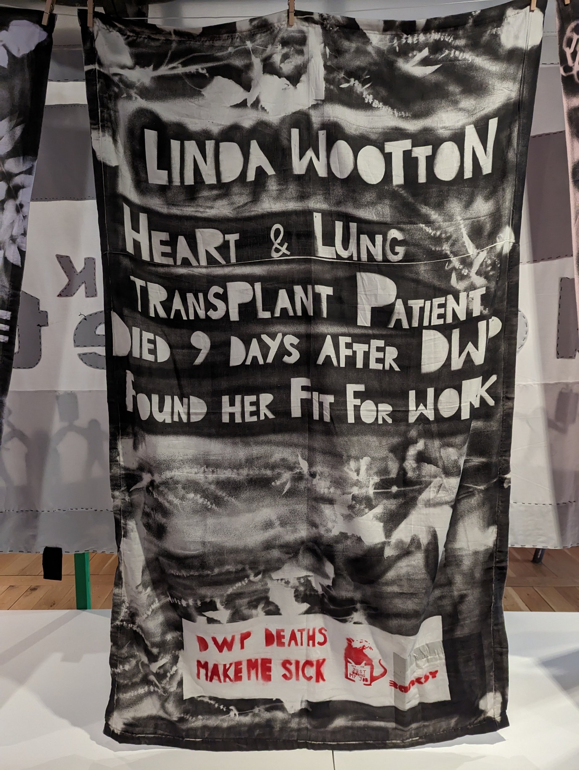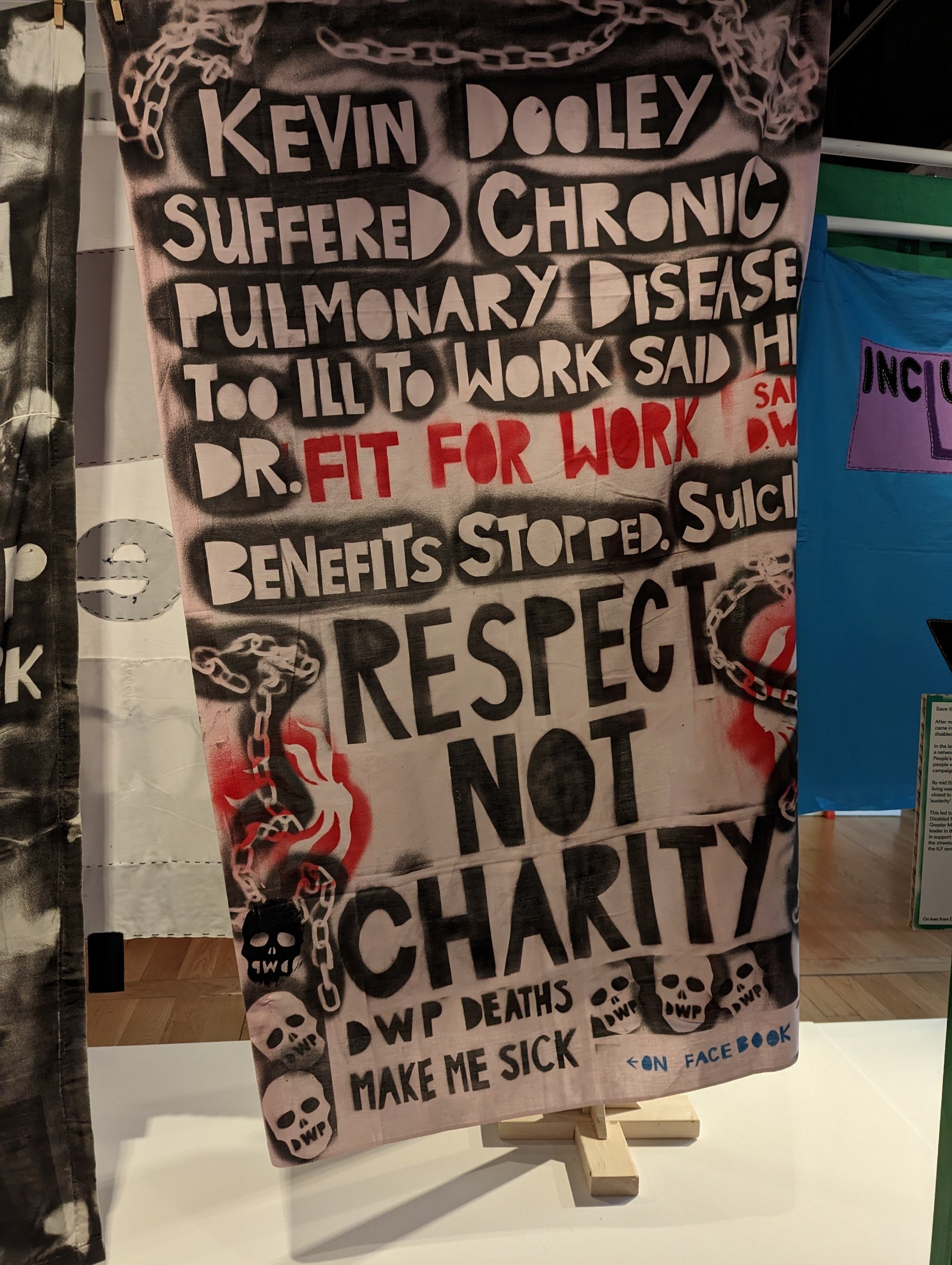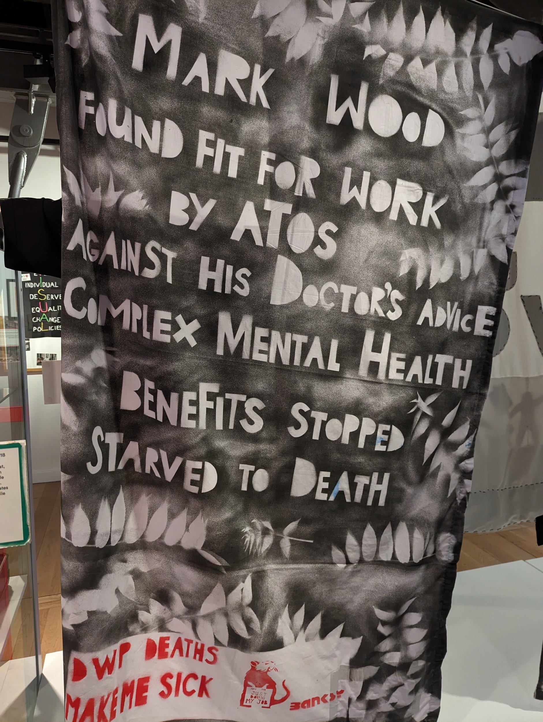 There were many banners from protests and events that had occurred historically, which were on loan to the museum. Some that really struck me were an ongoing series of shrouds made by artist Vince Laws; ‘DWP Deaths Make Me Sick’. I was left feeling incredibly saddened, after reading the banners and history behind the case studies.