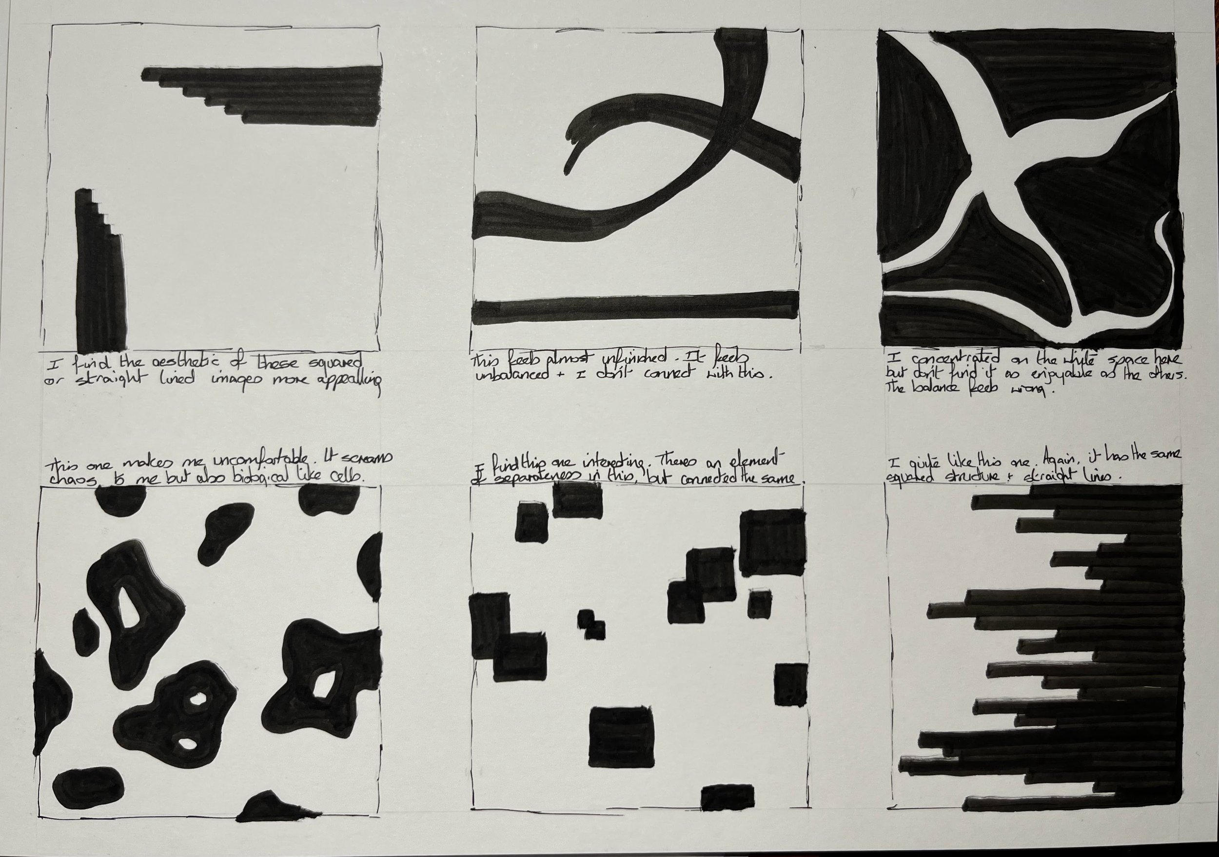Some quick thumbnails exploring black and white abstract expressionism, with notes on my own response.