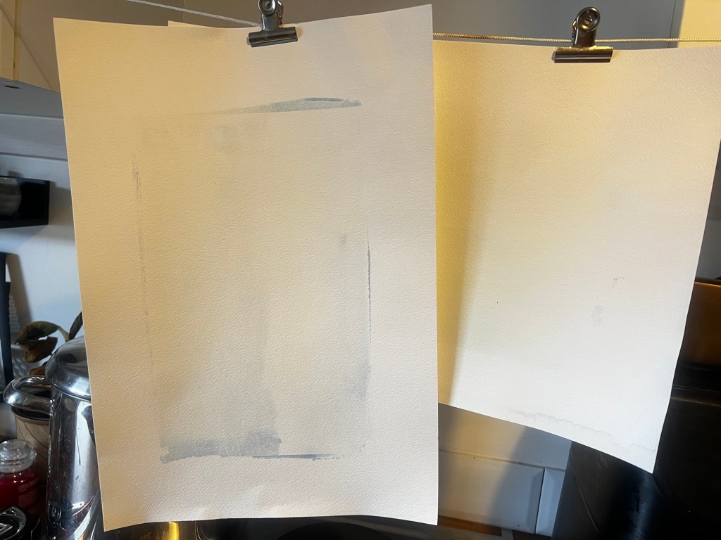 I did a second attempt on another piece I had prepped with the solution. This time, I added 10ml of white vinegar as I considered the water may be too alkaline. This did help part of the image cling to the paper, so I was correct in terms of the ph balance of the water, but there was still barely anything remaining on the paper.