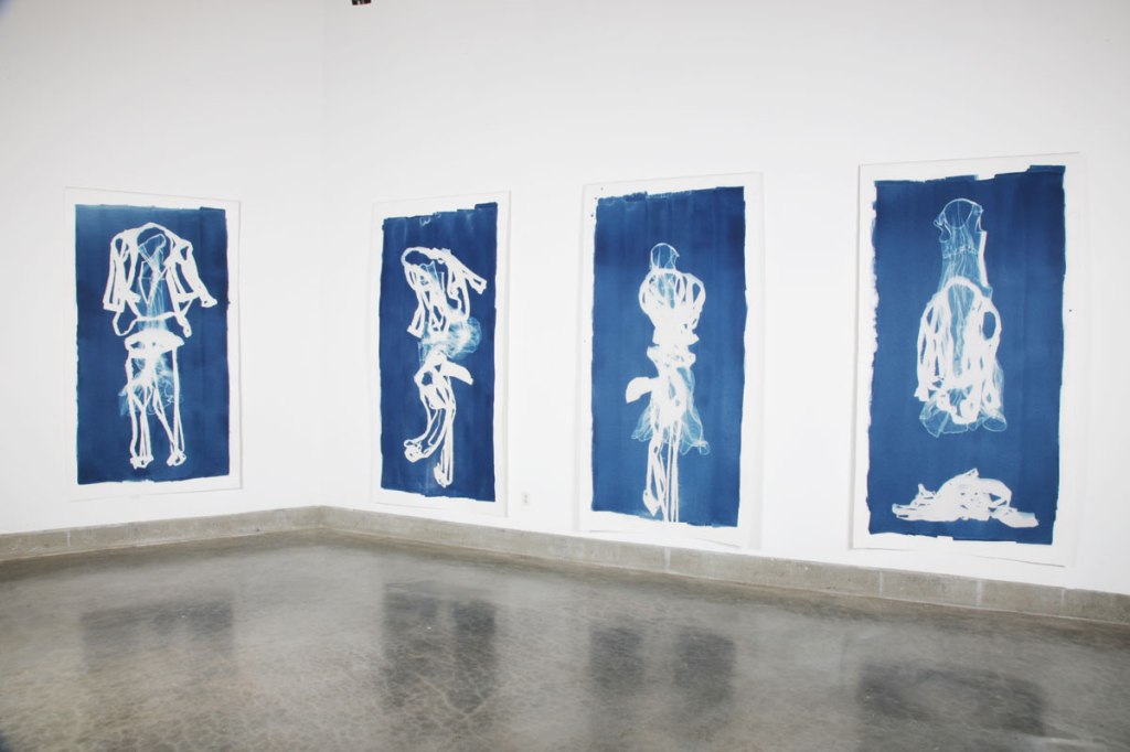 The second artist that stood out for me was Mary Beth Heffernan, who has also created large scale cyanotype images but on paper, using cut suit remnants.